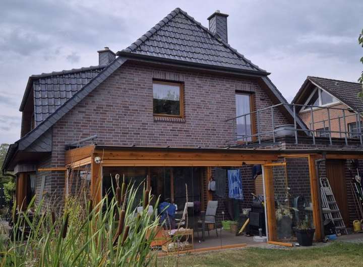 Massivbauweise mit Klinkerfassade, Krüppelwalmdach mit Gauben und Ziegeleindeckung, Holz-Fenster mit ISO-Doppel-Verglasung und Rollläden.