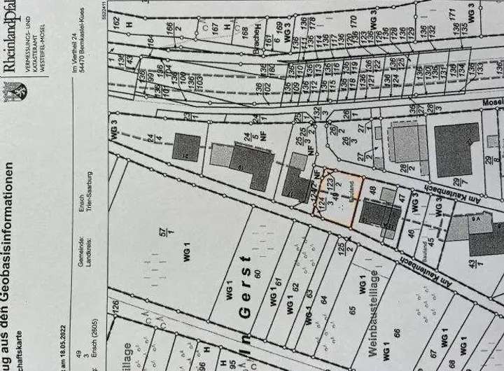 Das Grundstück befindet sich in ruhiger Ortsrandlage von Ensch, Am Kautenbach 17, 54340 Ensch. Der Ort liegt in der Verbandsgemeinde Schweich an der Römischen Weinstraße, direkt an der Mosel und ist umgeben von Weinbergen und Natur.