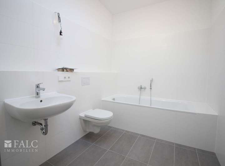 Das Badezimmer mit Badewanne und separater Dusche ist zeitlos hell gefliest. Zusätzlich gibt es ein Gäste-WC für Besucher. Die Sanitäranlagen sind von Villeroy und Boch. Das Badezimmer verfügt über Vellux Dachfenster.