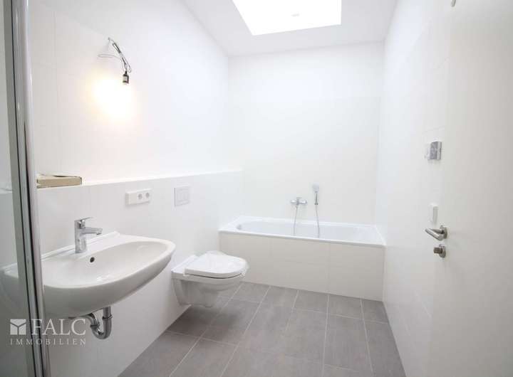 Das Badezimmer mit Badewanne und separater Dusche ist zeitlos hell gefliest. Zusätzlich gibt es ein Gäste-WC für Besucher. Die Sanitäranlagen sind von Villeroy und Boch. Das Badezimmer verfügt über Vellux Dachfenster.
