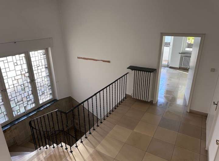 Der großzügige Eingangsbereich der Villa ist mit einem nach oben offenen Treppenraum mit Natursteinbelag und gusseisernen Stabgeländer sowie einer Garderobe und zwei Gäste-WC repräsentativ gestaltet. Hiervon gehen die geräumige und helle Küche und der angrenzende Essbereich ab. Der Essbereich ist mit dem Wohnbereich über einen weiten Wand - Durchbruch verbunden. An den Wohnbereich grenzt ein weiterer Aufenthaltsraum an. Durch einen bereits behobenen Wasserschaden wurde teilweise die abgehängte Decke entfernt, so dass die hohen Geschossdecken von über 3,50 Meter wieder zum Vorschein gekommen sind. Im Obergeschoss sind insgesamt drei Aufenthaltsräume sowie ein Badezimmer mit Dusche, ein Badezimmer mit Wanne und Dusche sowie ein separates WC angeordnet. Im Obergeschoss sind diverse Einbauschränke vorhanden, indem sich auch ein eingebauter Tresor befindet. An der nach Westen orientierten Straßenfassade ist das gelegene Zimmer mit einem Balkon vorgelagert. Die Flächen sind mit Natursteinbelag und Fliesen im Nassbereich ausgestattet.