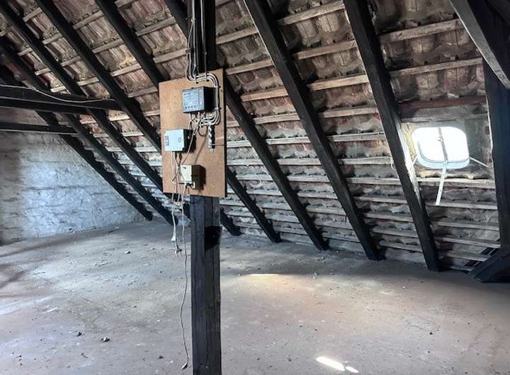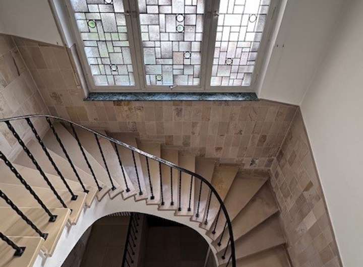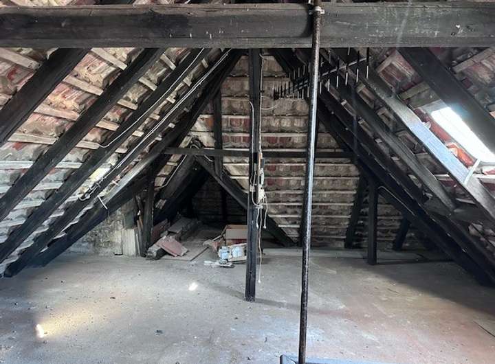 Das Dachgeschoss wird über eine halbgewendete Treppe erreicht. Es gibt drei Aufenthaltsräume mit Teppich- und Dielenbelag. Dem nach Osten ausgerichteten Aufenthaltsraum ist eine Terrasse vorgelagert, von dem man einen Ausblick in den Garten und der typischen begrünten Innenhofsituation dieser Randbebauung hat. Weiterhin ist hier ein Bereich mit WC, Badezimmer und Küchenanschlüsse vorhanden, so dass sich dieser Bereich als Büroebene oder als separate Wohnung für Hausangestellte oder ein Au Pair-Mädchen eignet. Vom Dachgeschoss aus wird über eine einläufige, Holz-Treppe der nutzbare, aber nicht ausgebaute und nicht gedämmte Spitzboden erreicht. In diesem Bereich könnte ein weiterer stimmungsvoller Raum mit einer Galerie zum Dachgeschoss geschaffen werden. Die Beheizung erfolgt überwiegend über Röhrenheizkörper in raumweiser Anordnung.