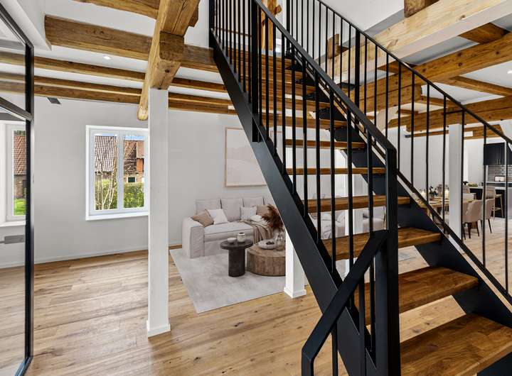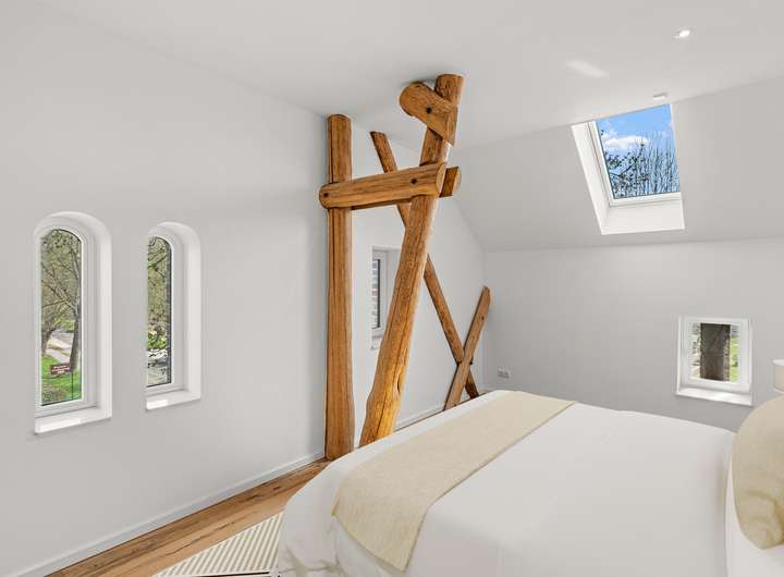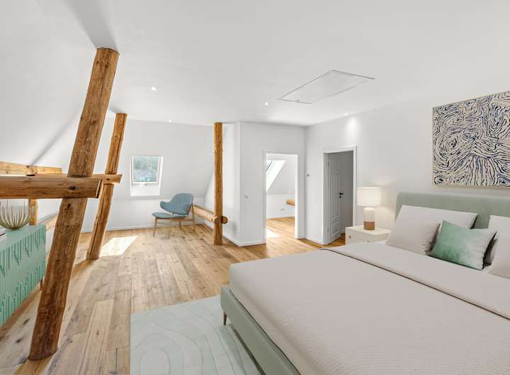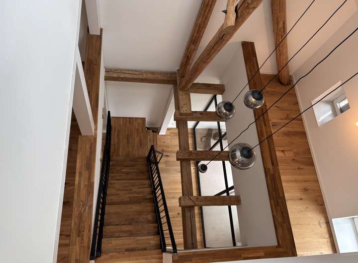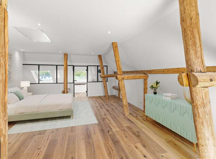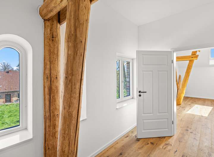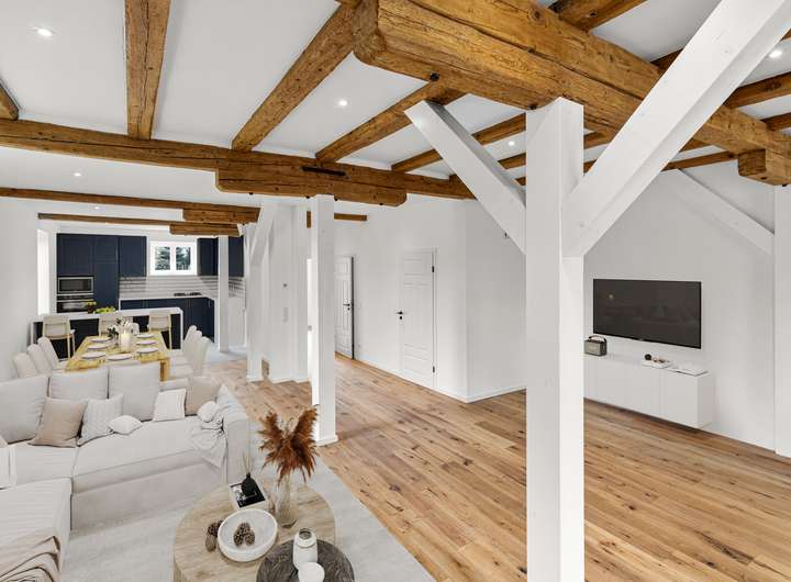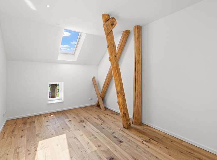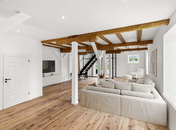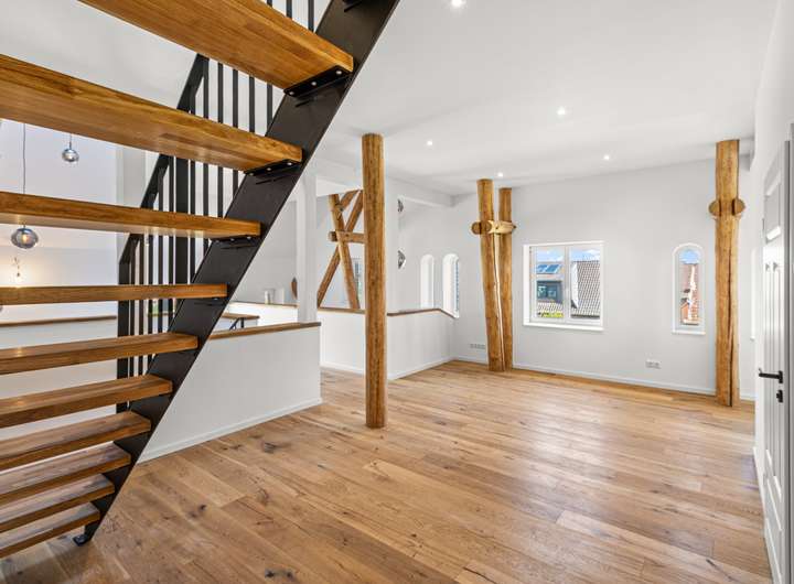 Für den Umbau dieser denkmalgeschützten Speicheranlage zu einem exklusiven Wohnhaus wurden sämtliche Decken und Fachwerkbalken aufgearbeitet und in den Wohnraum integriert. Von der Betonsohle über die Außenwände bis hin zum Dachziegel ist alles neu verbaut.
