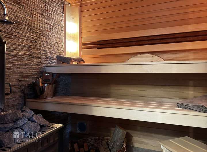 Ein besonderes Highlight des Anwesens ist das separate Wellnesshaus - Baujahr 2008 (ca. 19 m²), das mit einem lichtdurchfluteten Ruhebereich, einem stilvollen Tageslicht-Badezimmer und einer großzügigen Sauna ausgestattet ist. Eine angrenzende Terrasse im Grünen lädt zum Entspannen ein und schafft eine private Wohlfühloase direkt auf dem eigenen Grundstück.