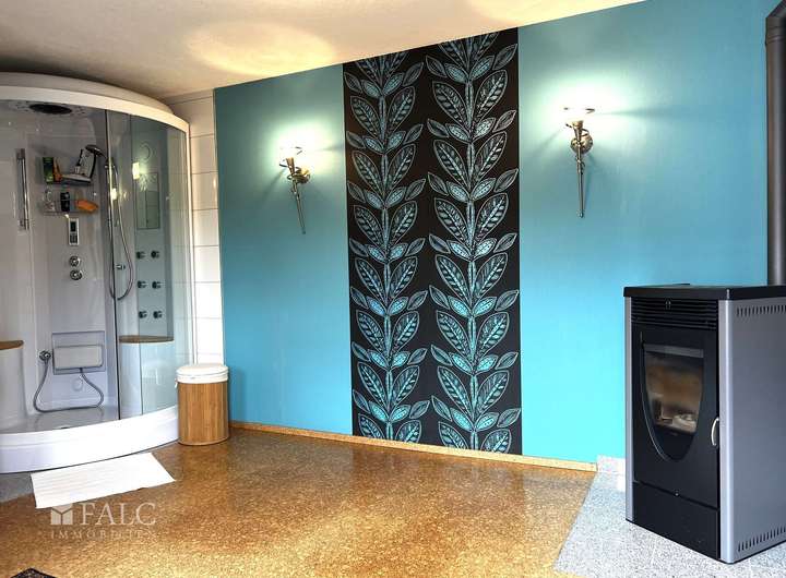 Wellnesshaus mit Ruhebereich und Pelletofen, Tageslichtbad und großer Sauna