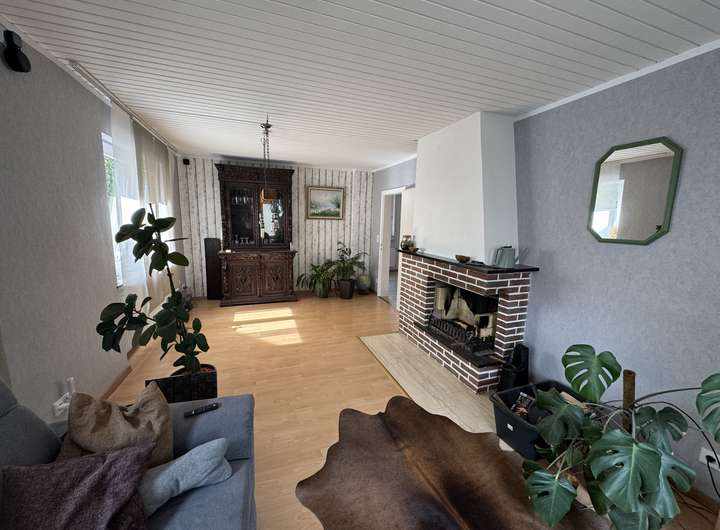 Im Erdgeschoß befindet sich eine großzügige Küche sowie ein einladendes, großes Wohnzimmerbereich, der sich hervorragend für gemeinsame Familienzeiten eignet. Im Wohnzimmer befindet sich ein offener Kamin, der gemütliche Wärme und Atmosphäre spendet. Große Fensterfronten sorgen zudem für helles Tageslicht und eine wohnliche Atmosphäre.