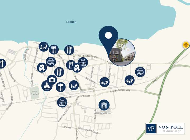 In unmittelbarer Nähe des Grundstücks befinden sich zahlreiche Restaurants, Einkaufsmöglichkeiten und Einrichtungen des täglichen Bedarfs, die eine hervorragende Infrastruktur garantieren. Der Zugang zu den umliegenden Naturgebieten, einschließlich des Ostseebads Dierhagen, das in etwa 10 km Entfernung liegt, ermöglicht es den Bewohnern, die wunderschöne Landschaft über gut ausgebaute Rad- und Wanderwege zu erkunden.