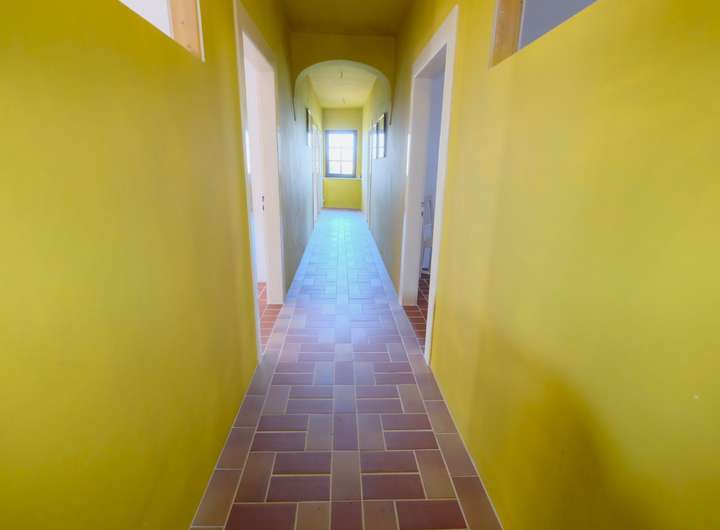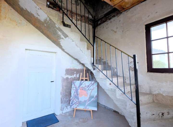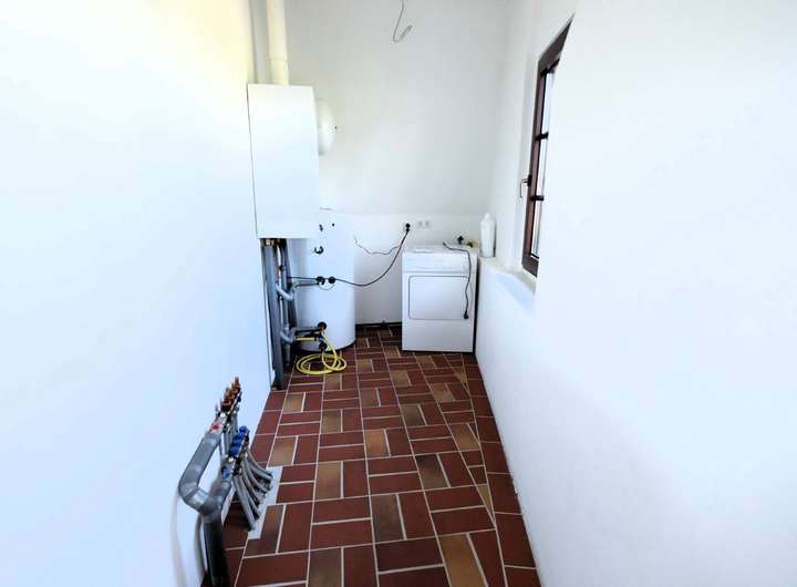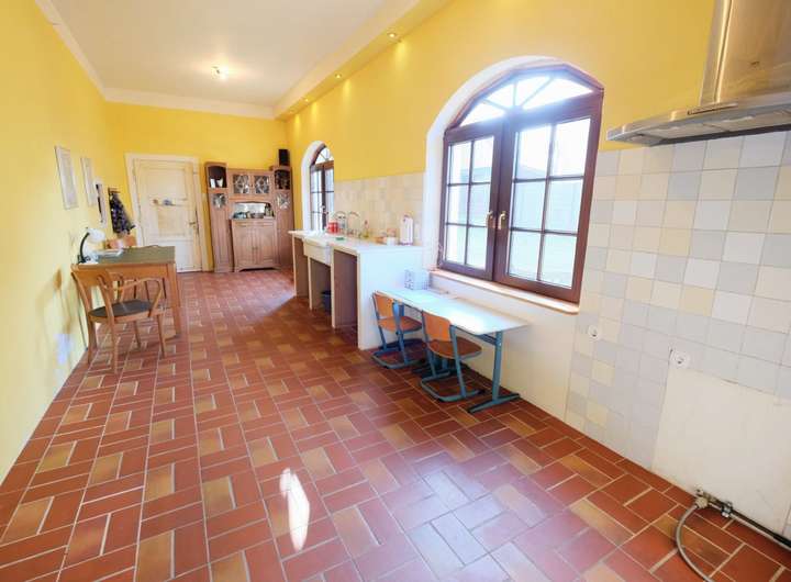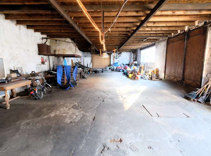 Das Einfamilienhaus mit ehemaliger Schmiede und großer Scheune wurde 1843 errichtet. Die Räumlichkeiten sollten aktuell renoviert werden. Das Wohnhaus ist teilweise ausgestattet mit Fensterrahmen aus Kunststoff und doppelverglasten Fenstern, der Fußboden wurde mit Fließen aus Keramik verlegt und gleichzeitig mit einer Fußbodenheizung versehen. Vom Eingangsbereich aus gelangen Sie in die geräumige Küche.