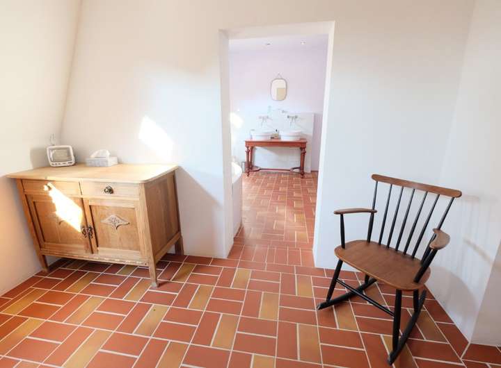 Eine Treppe führt von der Diele in den Flur der ersten Etage. Hier befinden sich auf der rechten Seite ein Schlafzimmer und das Badezimmer, das ausgestattet ist mit einer Badewanne, Dusche, Toilette und einem Waschtisch. Das Wohnzimmer und ein weiteres Schlafzimmer befinden sich auf der linken Seite des Hauses.