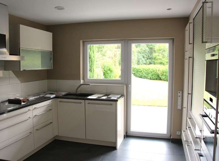 Die gehobene Einbauküche fügt sich stilvoll ins Design des Hauses ein. Für Komfort und Sicherheit sorgt eine Doppelgarage mit elektrischem Tor.