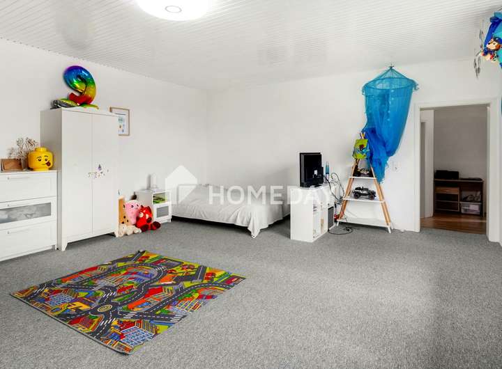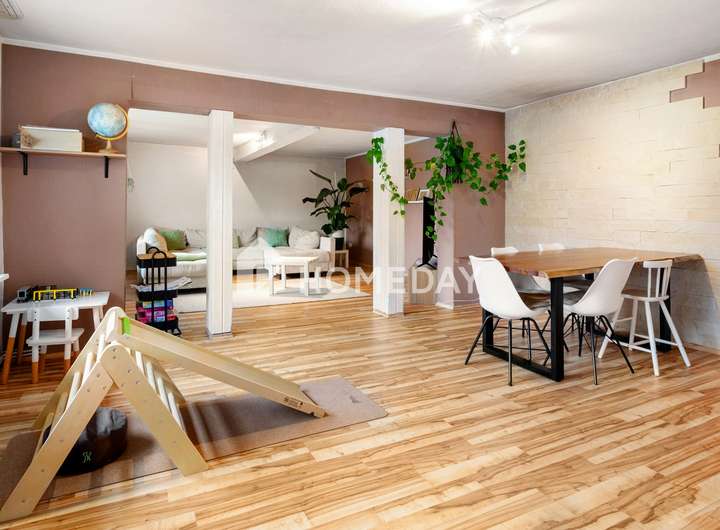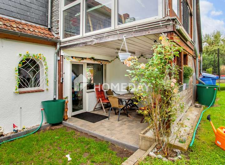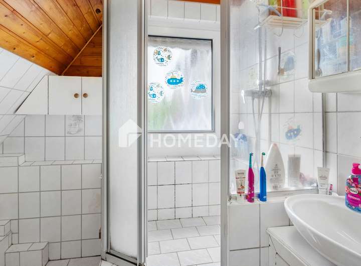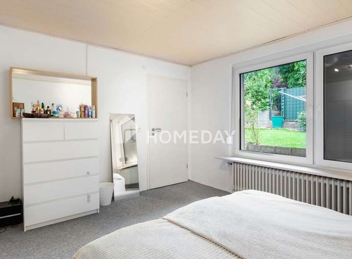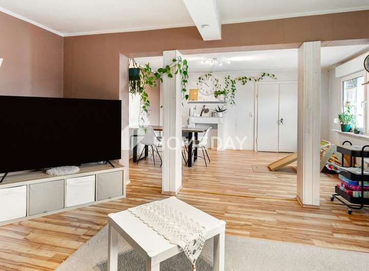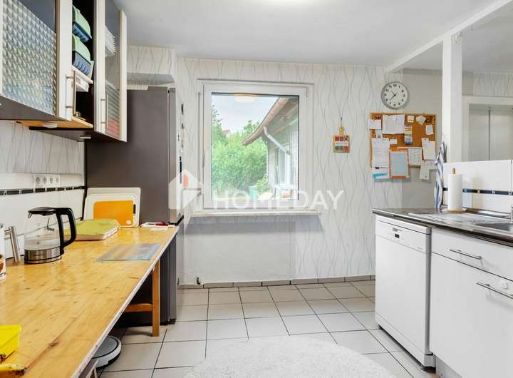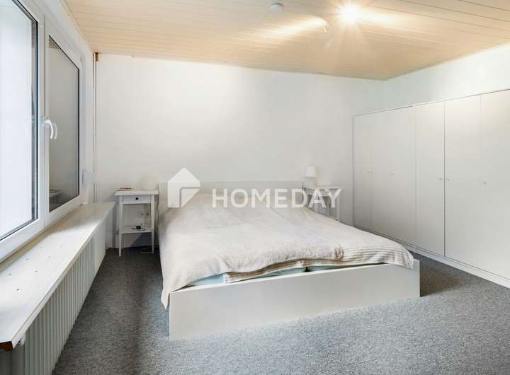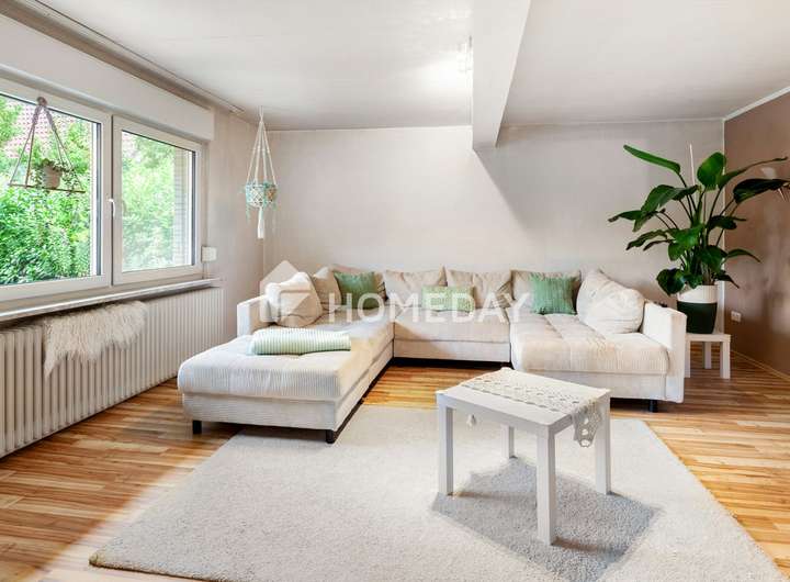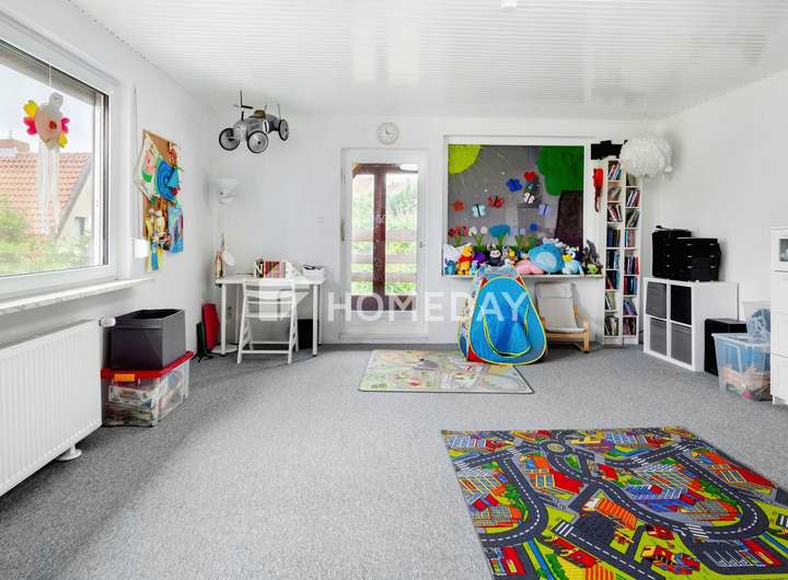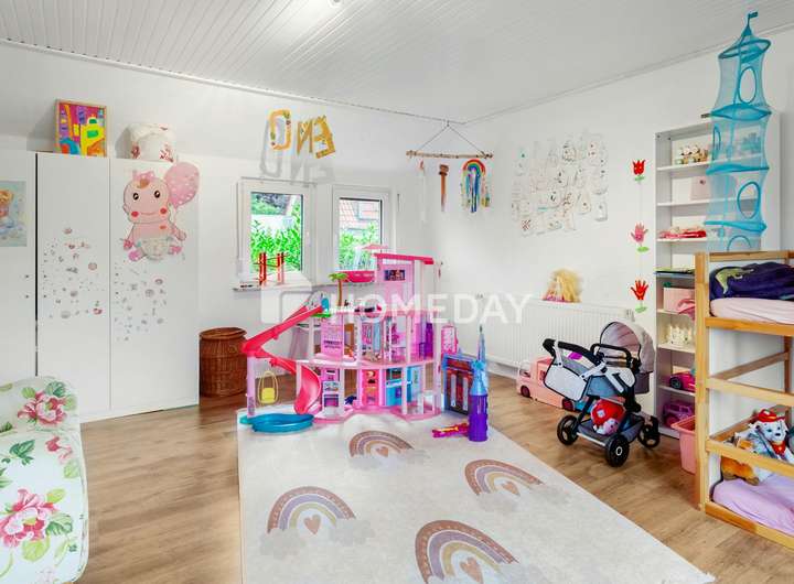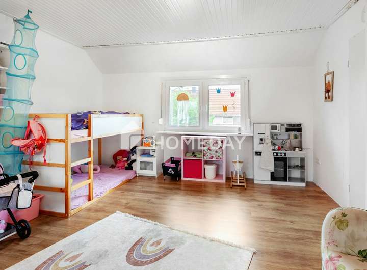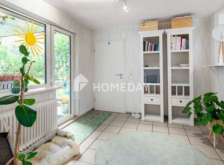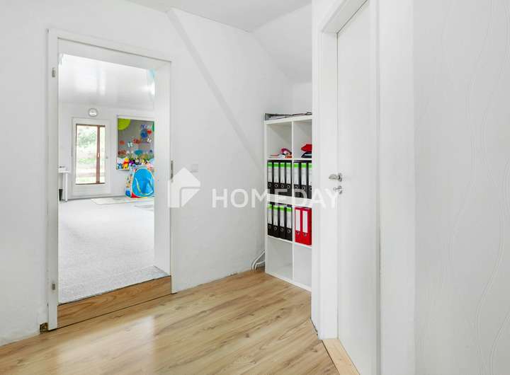 Die Innenräume präsentieren sich hell und freundlich. Geschmackvolle Holzdielen, Laminat, Fliesen und Auslegware schaffen ein abwechslungsreiches und wohnliches Ambiente. Der großzügige Wohnbereich im Erdgeschoss bildet das Herzstück des Hauses, von dem aus sich auch die Terrasse und der Garten betreten lassen. Ergänzt wird das Raumangebot durch eine funktionale Küche, zwei Bäder, ein Schlafzimmer sowie ausreichend Zimmer im Obergeschoss, die sich flexibel als Kinderzimmer, Gästezimmer oder Büro nutzen lassen.