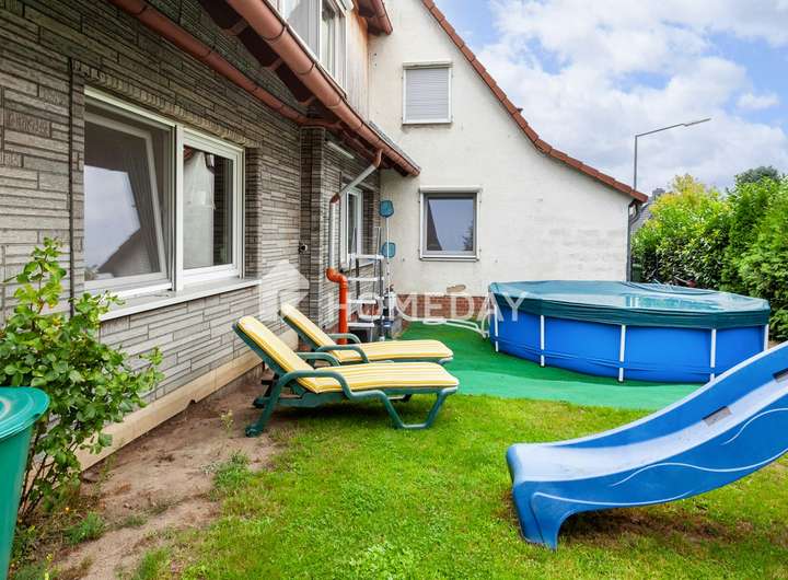 Das Haus befindet sich auf einem etwa 460 Quadratmeter großen Grundstück, das durch seine geschützte Lage und die liebevoll angelegten Außenbereiche besticht. Eine Terrasse, ein Garten mit Rasenfläche und Spielmöglichkeiten sowie ein Pool machen das Anwesen auch für Kinder besonders attraktiv. Gleichzeitig laden die Wintergärten und die lichtdurchfluteten Wohnräume zum Entspannen und Verweilen ein.