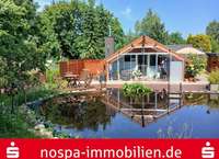 Kleines Haus auf einem angelegten Grundstück mit Badeteich und Nebengebäuden