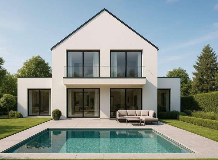 Das rechteckige Grundstück ist 567m2 groß und nach Südwesten orientiert. Es eignet sich optimal für die Errichtung eines Einfamilienhauses in offener Bauweise, dabei lässt sich eine Gesamtwohnnutzfläche von bis zu 317m2 auf 2 Wohnebenen erzielen. Das Bild zeigt ein Beispiel, wie das fertige Haus aussehen könnte. Bei Bedarf empfehlen wir Ihnen auch gerne zuverlässige Architekten und Baufirmen, um Ihre Vorstellungen vom neuen Eigenheim optimal zu verwirklichen.
