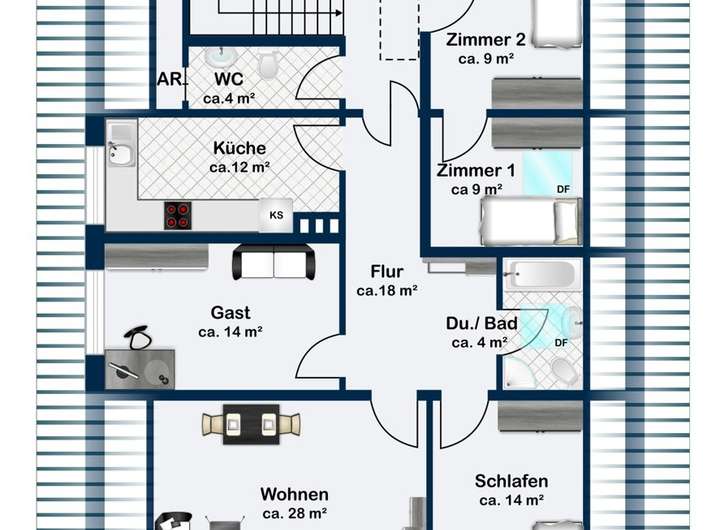 Dieses vielseitige Anwesen bietet zwei großzügige Wohneinheiten mit jeweils über 100m² Wohnfläche (ca 118 m² Erdgeschosswohnung und ca. 106 m² Dachgeschosswohnung) sowie eine zusätzlich vorhandene Einliegerwohnung im Souterrain mit ca. 66m² Wohnfläche.