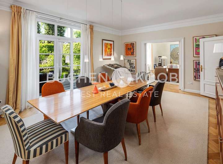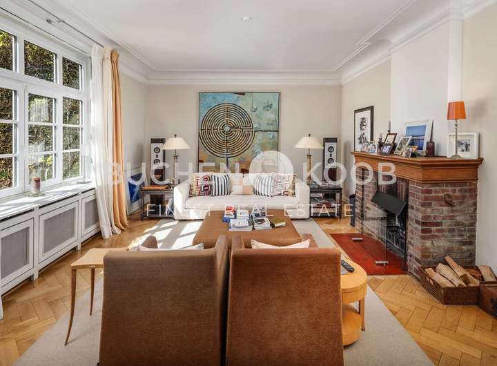 Alte Stilelemente | Fischgrätparkett | Fliesen aus dem Baujahr | 6 Schlafzimmer | 3 Bäder und 1 Gäste-WC | Hochwertige Ausstattung | Familiengerechter Grundriss | Baujahr um 1924 | Liebevoll angelegter Garten | Große Südterrasse | Großer Ost-Balkon | Garage | Stellplätze mit Wallbox | Keller