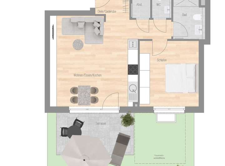Die 2,5-Zimmer-Wohnung überzeugt durch einen offenen Wohn- und Essbereich mit direktem Zugang zur Terrasse und Garten. Das Schlafzimmer mit Blick ins Grüne schafft Ruhe und Geborgenheit, das Bad mit großer bodenebener Dusche bietet modernen Komfort. Ergänzt durch ein Gäste-WC und Abstellraum wird die Wohnung zum durchdachten Zuhause für Singles oder Paare, die Wert auf Qualität und Atmosphäre legen. (Wohnung 2C)