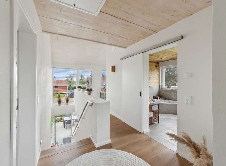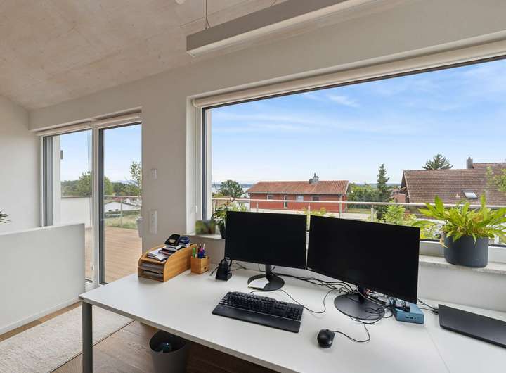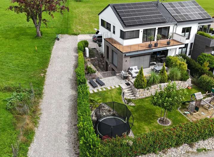Der weitläufige Garten ist ein Paradies für Kinder und zugleich ein Ort der Ruhe für Erwachsene. Ob sonnige Nachmittage auf der Terrasse oder ein Blick über den See bis in die Alpen – hier entsteht täglich ein neues Gefühl von Freiheit. Im Untergeschoss stehen großzügige Abstellflächen bereit, sodass sich auch der Alltag komfortabel organisieren lässt.