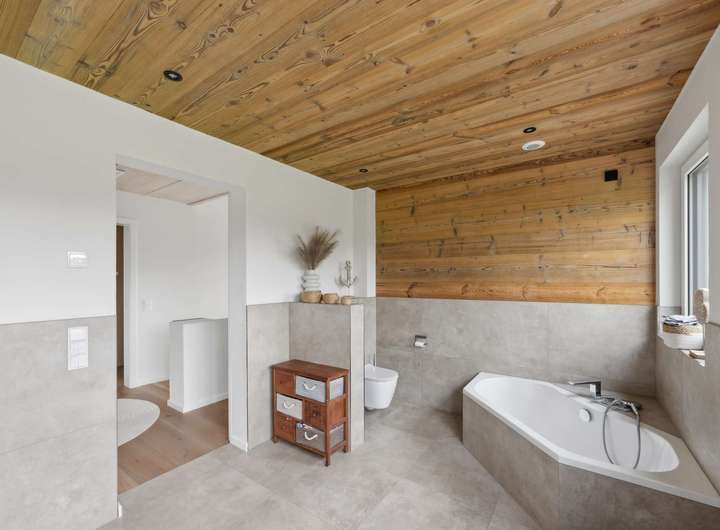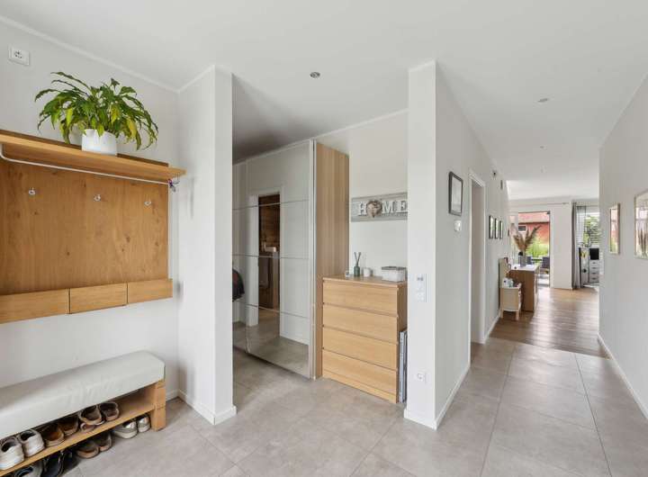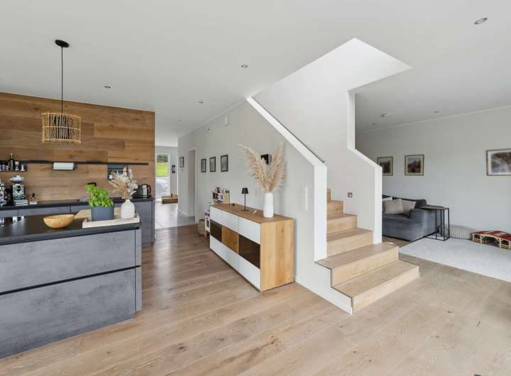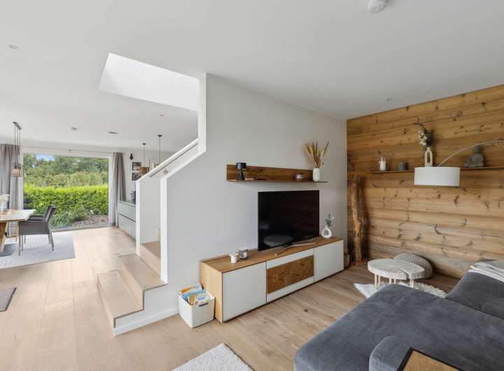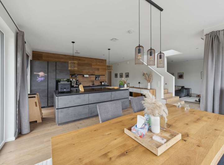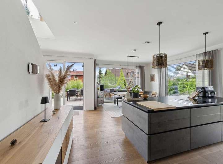 Die im Jahr 2021 fertiggestellte Immobilie bietet auf rund 183 m² Wohnfläche einen Wohnkomfort, der keine Wünsche offen lässt. Großzügige Räume, lichtdurchflutete Grundrisse und eine Ausstattung, die Maßstäbe setzt, prägen das Ambiente. Vier Schlafzimmer eröffnen vielfältige Nutzungsmöglichkeiten für Familien ebenso wie für Paare mit Anspruch an Raum und Individualität. Ein luxuriös ausgestattetes Hauptbadezimmer im Obergeschoss mit bodenebener Walk-in-Dusche und zusätzlich eleganter Eckbadewanne, sorgt für modernen Komfort. Ergänzt wird das Ensemble durch ein Gäste-WC im Erdgeschoss mit eigener Dusche. Stilvolle Parkett- und Fliesenböden sowie elektrisch gesteuerte Jalousien in allen Räumen unterstreichen die Hochwertigkeit des Hauses. Die Einbauküche überzeugt mit modernster Ausstattung und bietet den perfekten Rahmen für gesellige Stunden und kulinarische Erlebnisse.