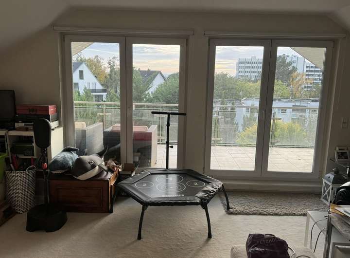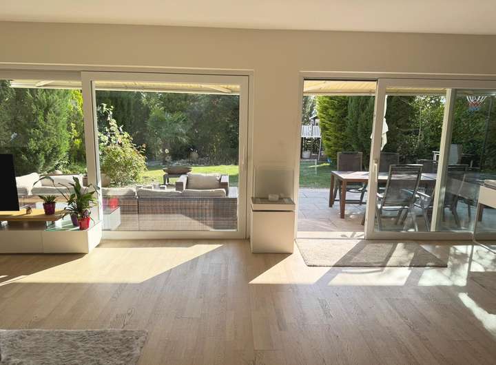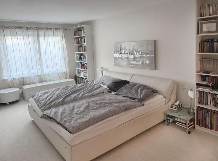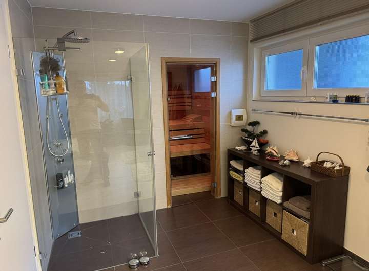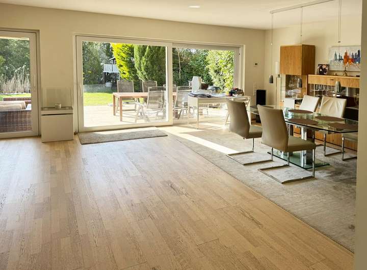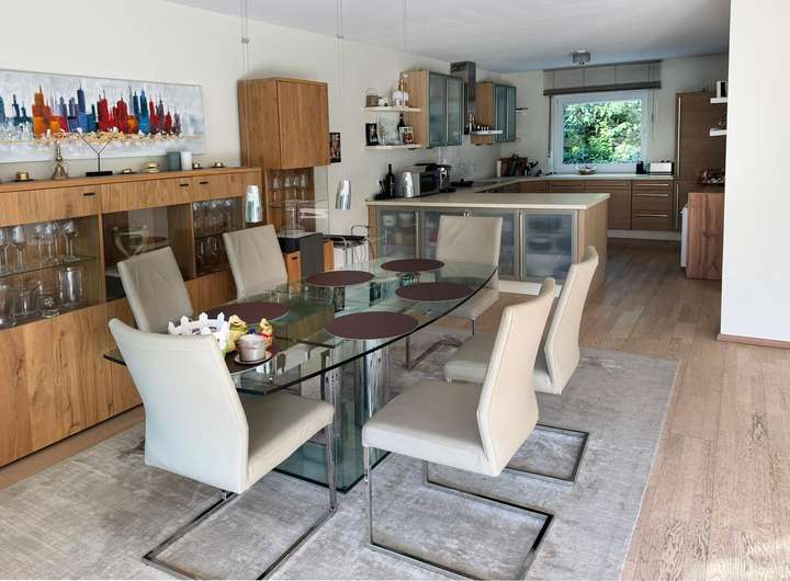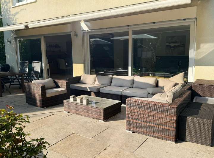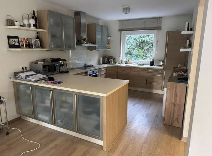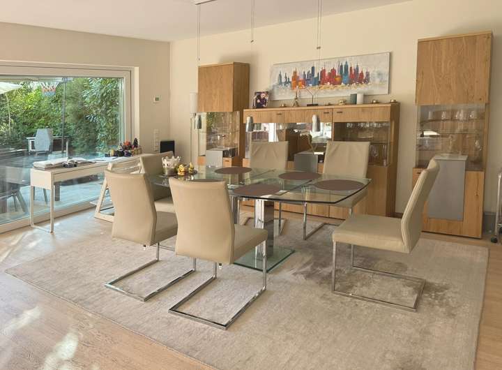 Balkon, Terrasse, Garten, Vollbad, Sauna, Einbauküche, Gäste-WC, Barrierefrei, Parkett, Teppichboden, Fliesen Bemerkungen: Hochwertige Ausstattung mit Eiche-Parkett und extrahoher Decke von 2,6 m, Fußbodenheizung, elektrische Jalousien, Markisen und Rollläden. Großformatige Fliesen in dem großen Bad mit Sauna und bodengleicher Dusche.