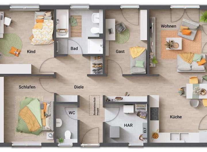 Der offen gestaltete Wohn-, Koch- und Essbereich ist das Zentrum des Familienlebens. Hier wird gemeinsam gekocht, gelacht und entspannt. Die bodentiefen Fenster lassen nicht nur viel Licht hinein, sondern ermöglichen auch vielfältige Zugänge zum Garten. Ob von der Küche oder vom Sofa aus, Ihre Wohlfühloase im Grünen ist stets nur ein paar Schritte entfernt. Besonders praktisch und platzsparend ist die integrierte Garderobe im Flur. Außerdem gibt es verschiedene Wohnbereiche, die auf Wunsch mit (Glas-)Türen abgetrennt werden können.