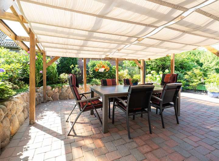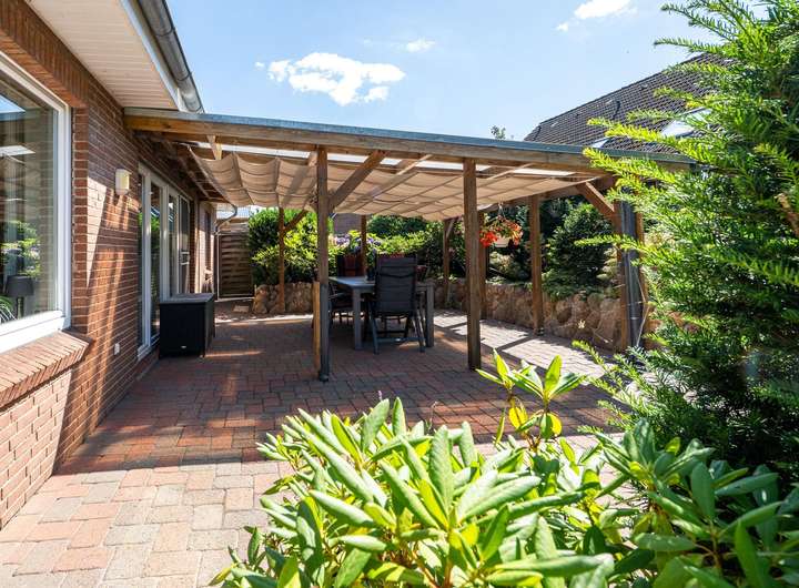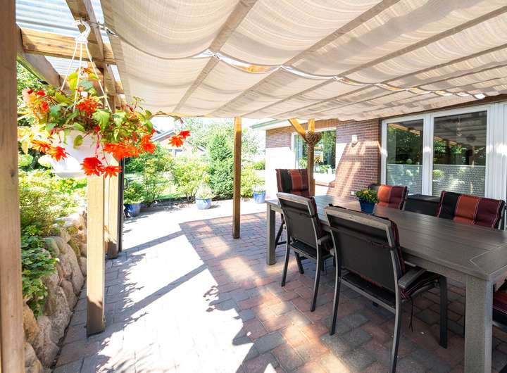 Die großzügige Sonnenterrasse wurde um einem attraktiven Terrassenüberdachungsbereich erweitert.