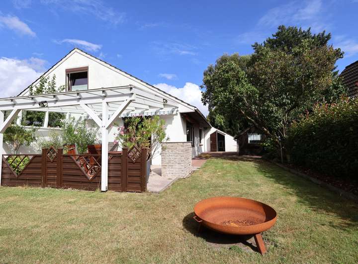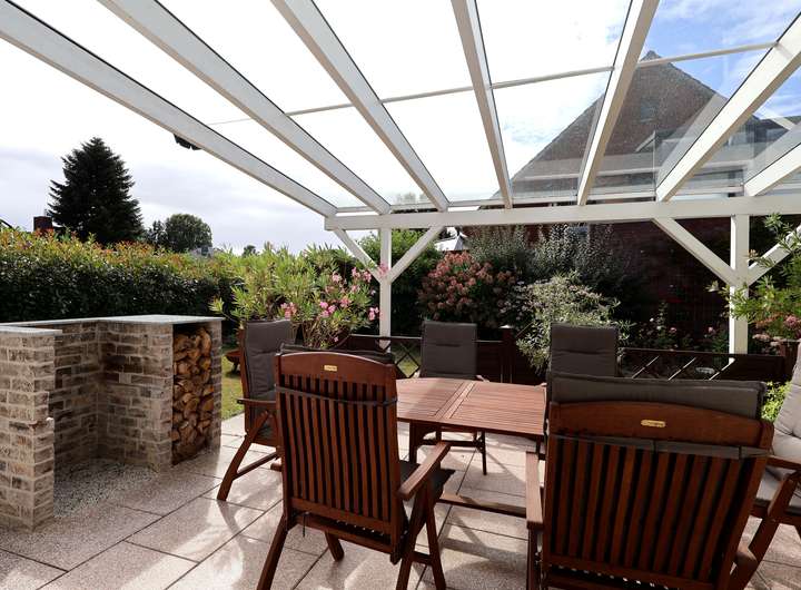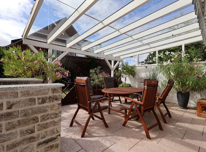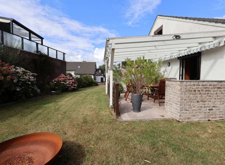 Die großzügige Terrasse mit ihrer Überdachung und dem gemauerten Grill ist der ideale Ort für entspannte Abende und gesellige Barbecues. Für zusätzlichen Schatten sorgt eine elektrisch ausfahrbare Markise, sodass Sie auch an heißen Tagen einen kühlen Kopf bewahren. Der große, gepflegte Garten lädt zu Spielen und Erholen ein.