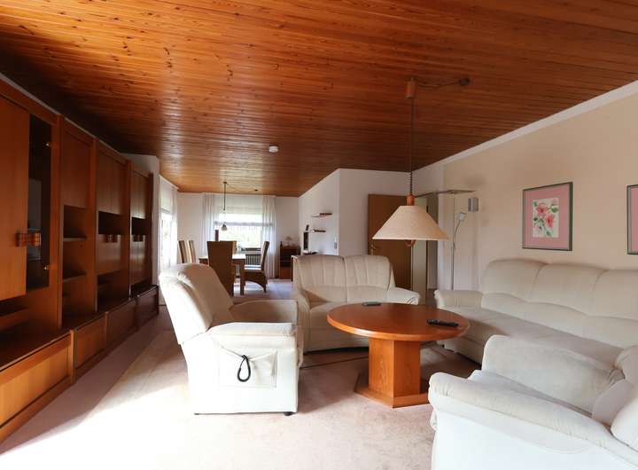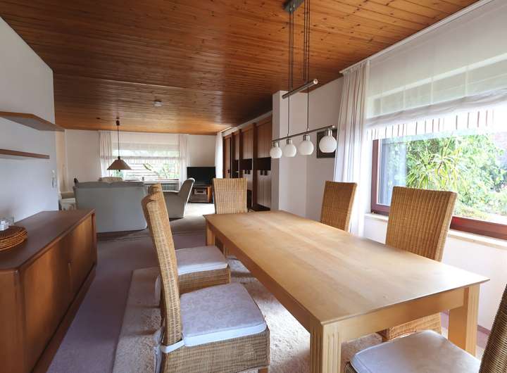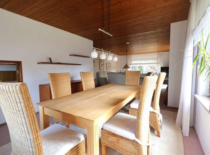 Großes Wohn- und Esszimmer: Das Herzstück des Hauses ist der helle, offene Wohnbereich, der mit einer praktischen Durchreiche zur Küche ausgestattet ist und viel Platz für das Familienleben bietet.