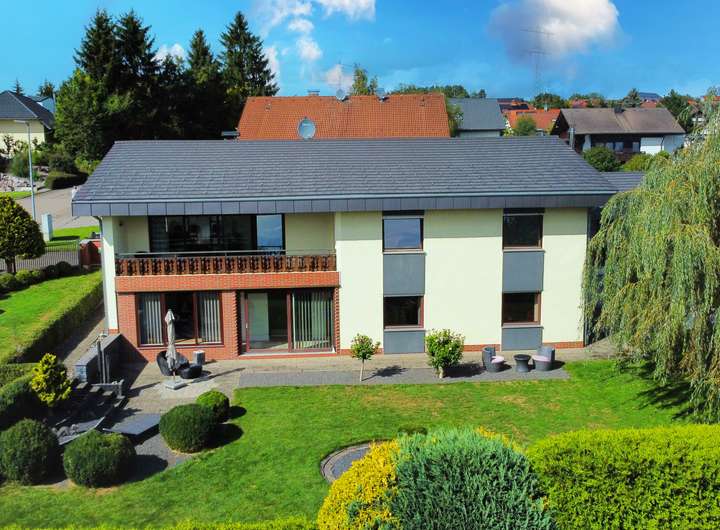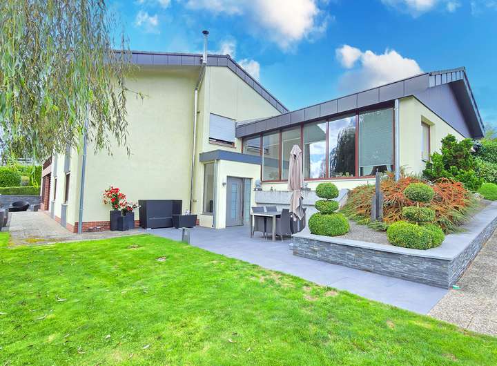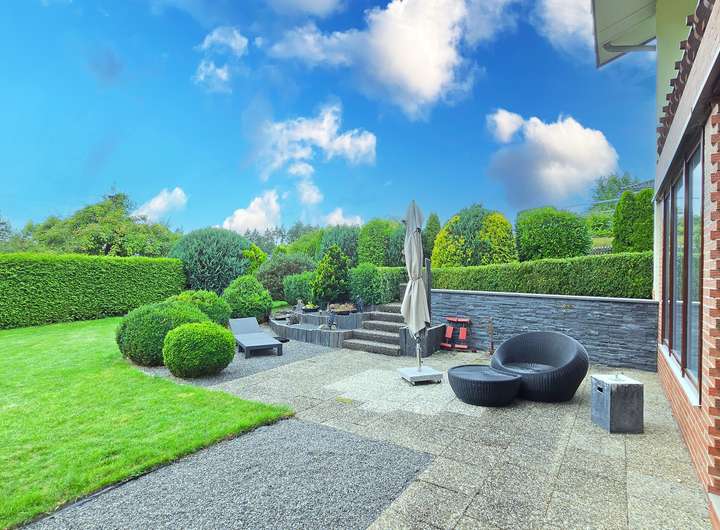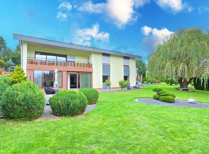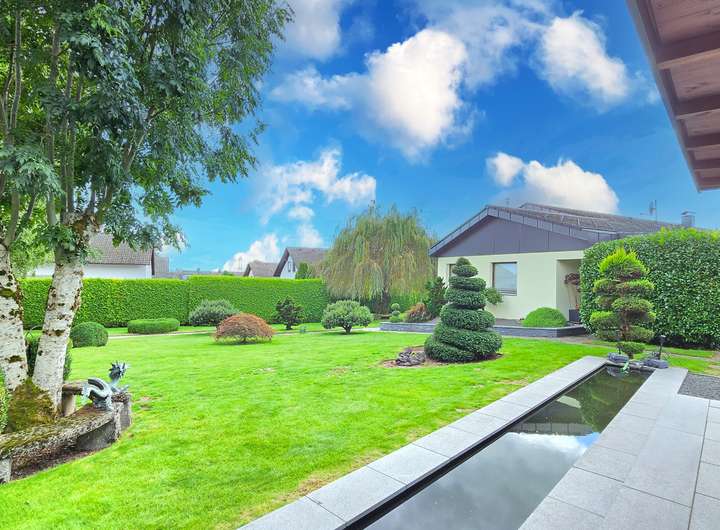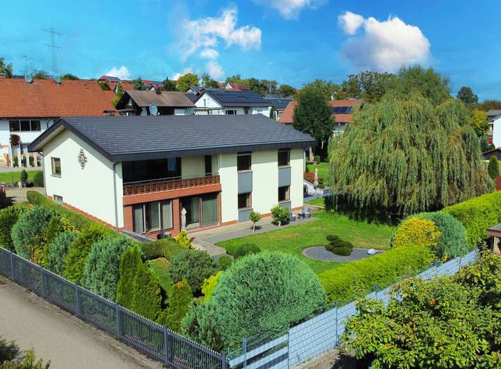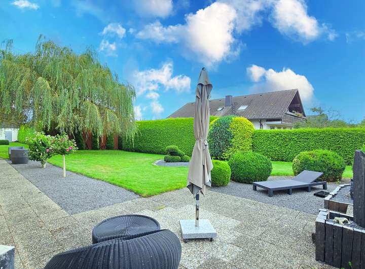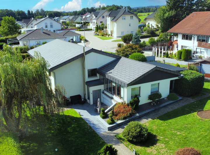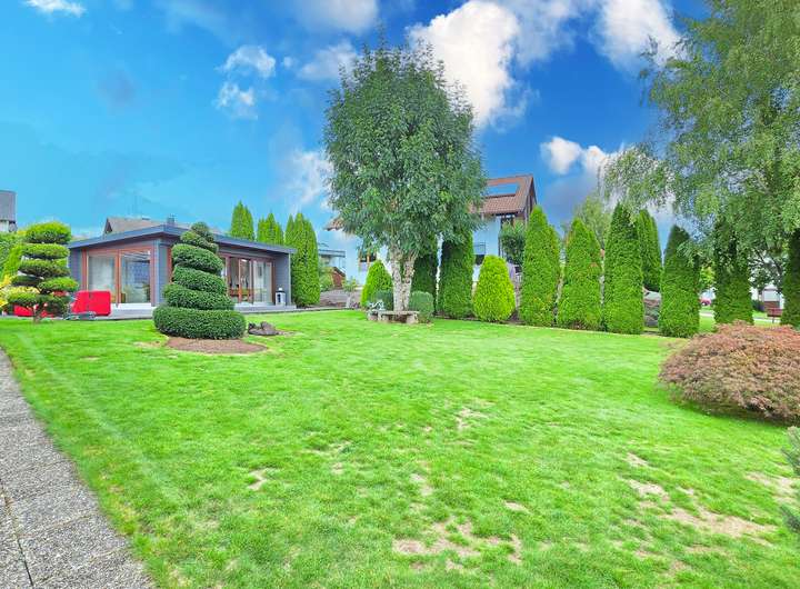 Dieses großzügige Zweifamilienhaus in ruhiger und naturnaher Aussichtslage verbindet stilvolle Wohnqualität mit durchdachter Architektur und einem außergewöhnlich großen Grundstück samt zusätzlichem Baufenster. Auf einem weitläufigen Grundstück mit insgesamt ca. 1.933 m² Fläche erstreckt sich eine parkähnliche Gartenanlage mit liebevoll angelegten Außenbereichen, mehreren Sitzplätzen und Terrassenflächen, die sowohl Ruhe als auch Privatsphäre bieten. Die Immobilie vereint auf harmonische Weise modernen Wohnkomfort mit einem Ambiente zum Wohlfühlen – eingebettet in eine idyllische Umgebung mit viel Potenzial.