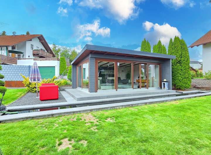 Ein absolutes Alleinstellungsmerkmal dieses Angebots ist das zusätzliche, noch unbebaute Baufenster mit ca. 600 m² Fläche auf dem Grundstück. Dieses eröffnet Raum für künftige Entwicklung – sei es durch den Bau eines weiteren Hauses, ein separates Büro oder Atelier, ein Gartenhaus oder eine weitere Wohneinheit. Ein solches Potenzial ist in dieser Form äußerst selten zu finden und verleiht der Immobilie nicht nur zusätzliche Flexibilität, sondern auch eine attraktive Wertsteigerungsperspektive. Die Außenanlagen sind nicht nur großzügig, sondern auch funktional gestaltet. Das komplett eingezäunte Grundstück beherbergt eine große Doppelgarage sowie eine weitere separate Garage und bietet darüber hinaus fünf zusätzliche Stellplätze – ideal für Familien mit mehreren Fahrzeugen, Besucher oder eine gemischte Wohnnutzung. Ein modernes Gartenhaus mit kompletter Ausstattung (inkl. Stromanschluss und Möblierung) rundet das Angebot ab und bietet zusätzlichen Raum für Freizeit, Hobby oder Gäste.
