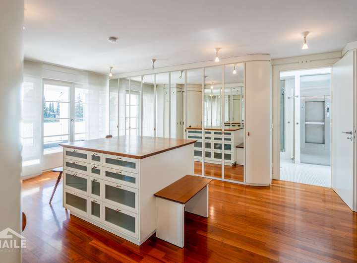 Wer Mode liebt, wird die Ankleide schätzen. Dieser repräsentative Raum bildet das Zentrum des Haupt-Schlafbereichs, der zudem ein großzügiges Badezimmer mit Dusche und Eckbadewanne umfasst und nahtlos in den Fitnessbereich mit Sauna übergeht. Über eine erfrischende Terrasse besteht außerdem Zugang zu einem separaten Ruheraum.