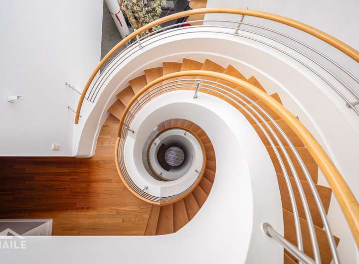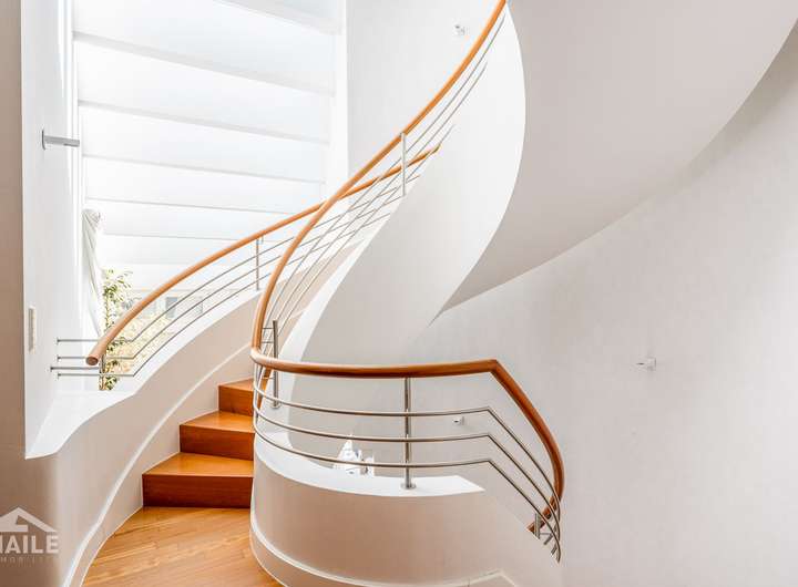 Den umwerfenden ersten Eindruck gewinnt man direkt nach dem Eingangsbereich, wenn sich der offene und großzügige Wohn- und Essbereich öffnet und die architektonisch gelungene Treppe direkt ins Auge fällt. Besonders schön sind die nach Süden und Westen ausgerichteten, überdachten Terrassen, die im Sommer zum Verweilen einladen.