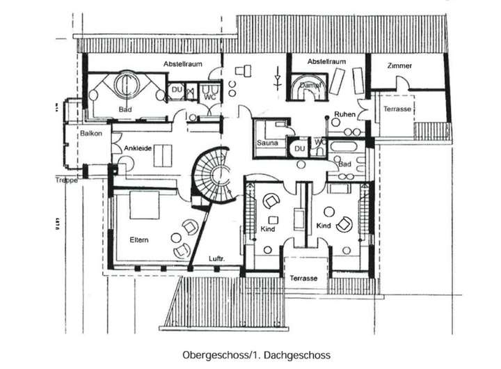 Schlafzimmer, große Ankleide, großzügiges Badezimmer, Fitnessraum mit Sauna und Ruheraum, zwei Kinderzimmer mit Bad und WC sowie eigener Terrasse.