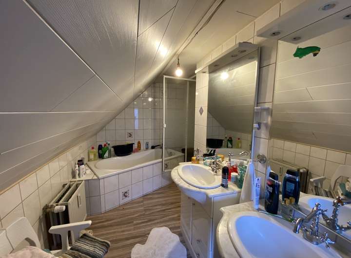 Im Dachgeschoss treffen Sie auf ein Schlafzimmer, ein Wohnbereich mit Küchenzeile, eine Küche, ein Gäste-WC und Bad mit Dusche und Wanne.