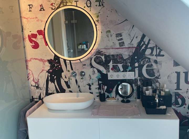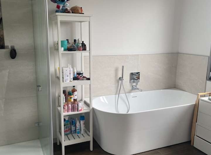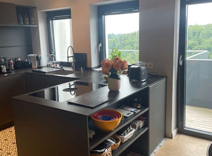 Die Aussattung ist sehr hochwertig, überall sind Markenfliesen oder Parkettboden, es gibt diverse Einbauschränke die sich in die Räume einfügen, viel Platz bieten und dazu kommt die hochwertige Küche.