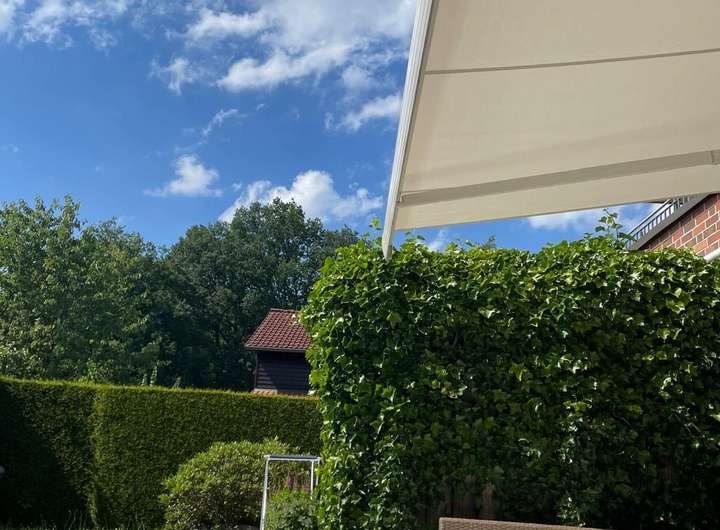 Alle Holzfenster haben jeweils elektrische Jalousien, eine Markise über der Terrasse ist vorhanden.