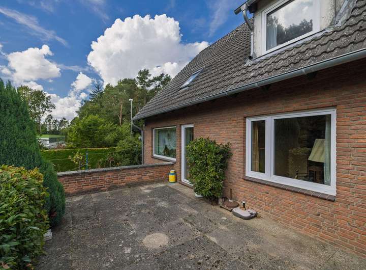 Der Außenbereich lädt zum Verweilen ein: Eine sonnige Terrasse und der private Garten bieten viel Platz für Entspannung, Spiel und gesellige Stunden im Freien.
