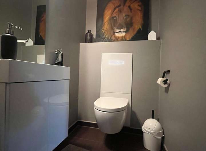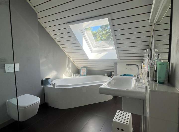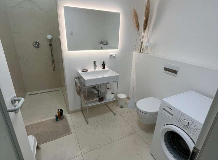 • Bad mit italienischen Sandsteinfliesen, bodengleicher Dusche, Siemens-Waschmaschine