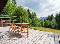Die ca. 38 m² große, sonnige Südterrasse lädt zum Verweilen ein – mit traumhaftem Blick in die umliegende Bergwelt. Eine kleine Nebenhütte bietet praktischen Stauraum für Gartengeräte.
