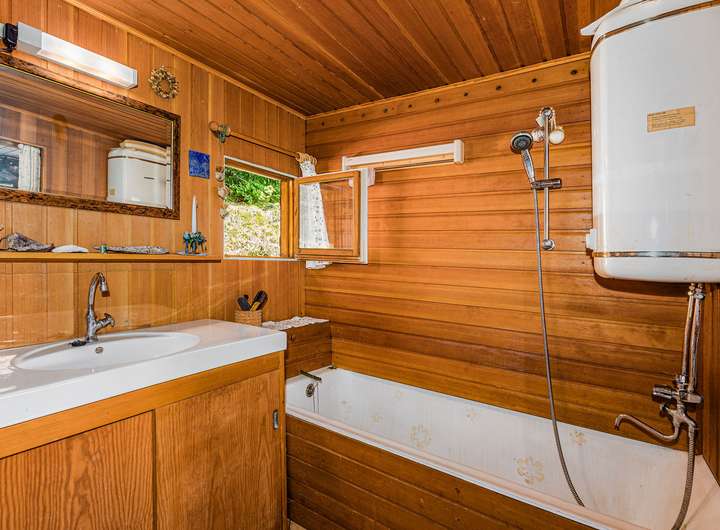 Etwa 50 Meter entfernt, entlang der geschotterten Zufahrtsstraße, befinden sich zwei PKW-Stellplätze auf dem eigenen Grundstück. Ein kleiner Pfad führt von dort direkt zur Hütte. Entlang der Straße plätschert ein idyllischer Bachlauf und unterstreicht die naturnahe Atmosphäre.