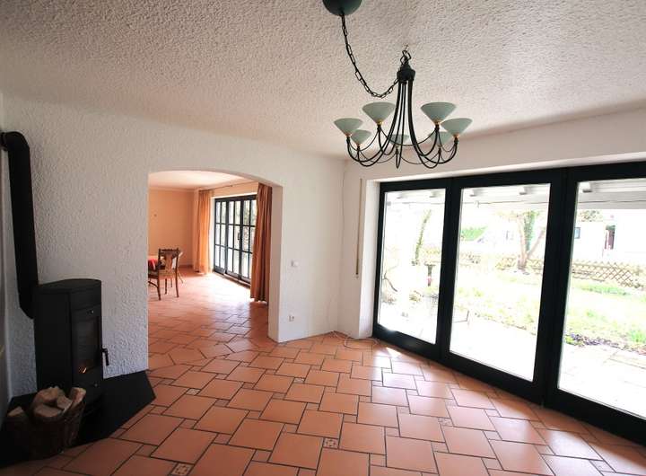 Im EG befindet sich das große und lichtdurchflutete Wohnzimmer mit einem gemütlichen Kaminofen und Zugang zum offenen, separaten Essbereich.