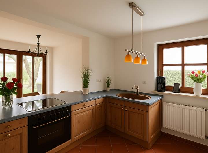 Die lichtdurchflutete Küche ist mit einer EBK inkl. Geräte ausgestattet und zum Essbereich hin mittels einer großen Durchreiche offen gestaltet, womit man gegenüber eine tolle Thekensituation geschaffen hat.