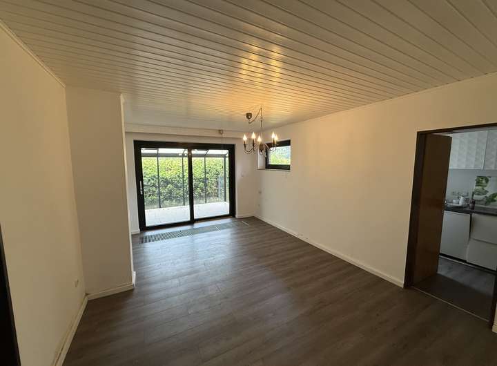 Im Erdgeschoss befinden sich neben dem Wohnzimmer das Esszimmer mit Zugang zur überdachten Terrasse. Zwei Schlafzimmer, die Küche sowie im hinteren Bereich des Hauses der Sanitärbereich.