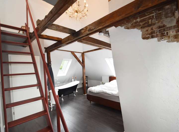 Ein echtes Highlight bildet das lichtdurchflutete, imposante Schlafzimmer im Dachgeschoss.