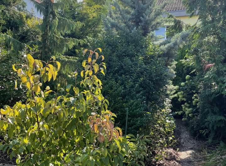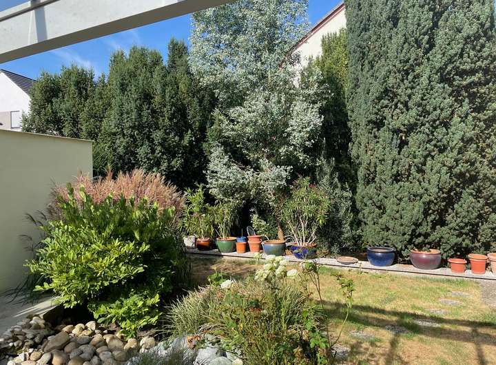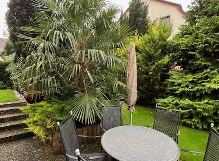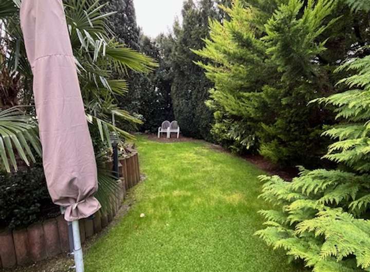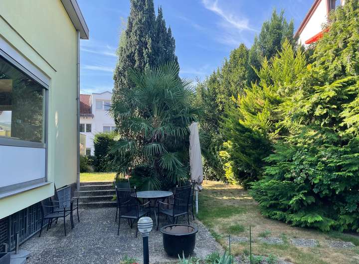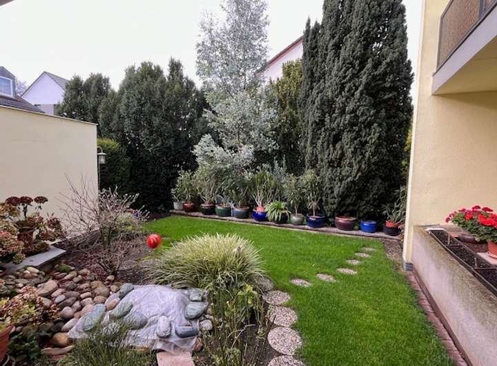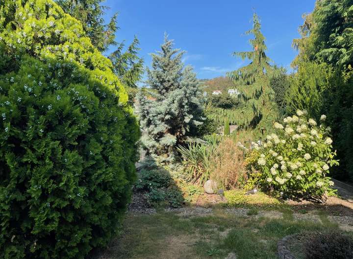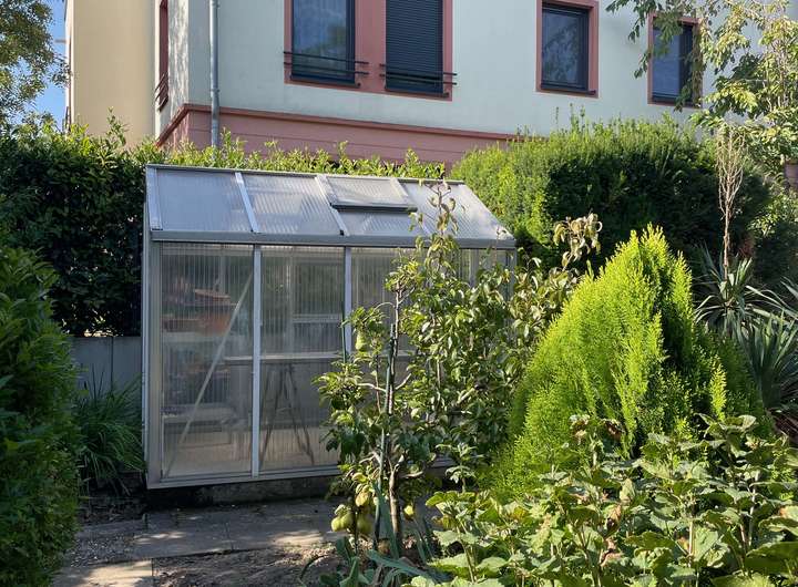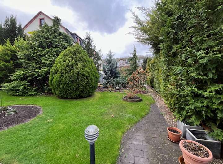 Der sehr gepflegte Garten mit insgesamt 345 m² ist in einen Zier- und einen Nutzgarten geteilt. Gartenliebhaber freuen sich über die Möglichkeit, ein beheiztes Gewächshaus sowie einen gemauerten Geräte-Schuppen nutzen zu können. Auf verschiedenen – z.T. überdachten Plätzen – können Sie entspannen oder Feste feiern. Für die Bewässerung des Gartens sorgt eine eigene Pumpe, die eine unabhängige (kostenlose) Wasserversorgung garantiert.