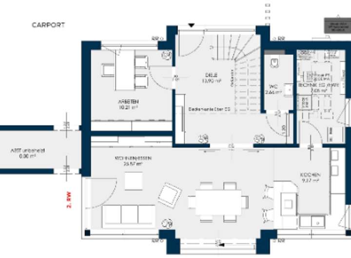 Das Haus zeichnet sich durch eine gehobene Ausstattung aus. Beheizt wird es mit einer effizienten Wärmepumpe in Kombination mit Fußbodenheizung und Wohnraumlüftung für Frischluft rund um die Uhr. Zur serienmäßigen Ausstattung gehört auch die Photovoltaikanlage zur Stromerzeugung und ein Stromspeicher inklusive Energiemanagement.