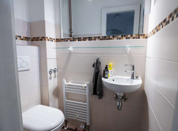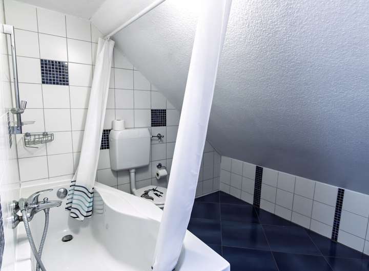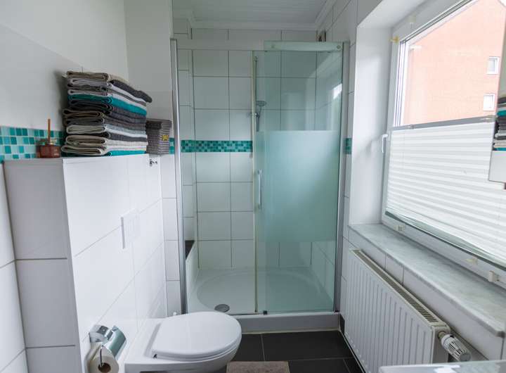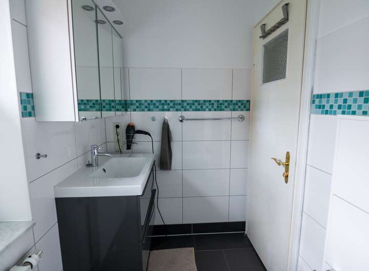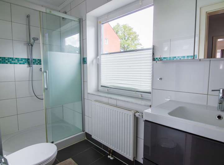 Gäste-Bad weiß gefliest, Duschbad im Obergeschoss, Wannenbad im Dachgeschoss, saniert ca. 2019