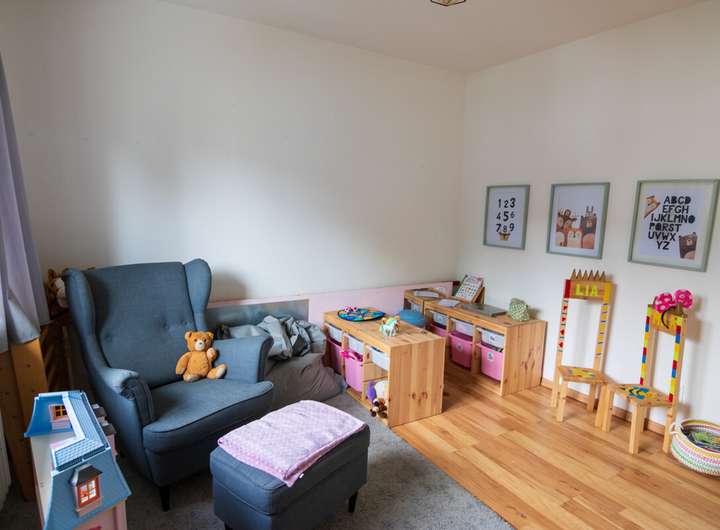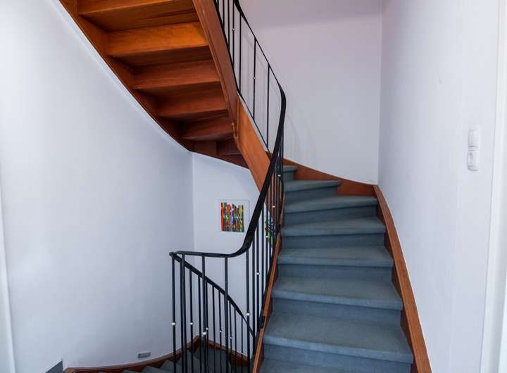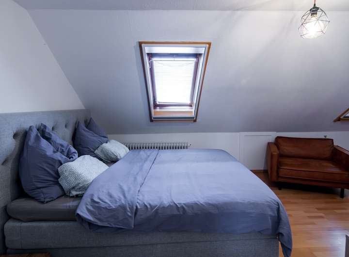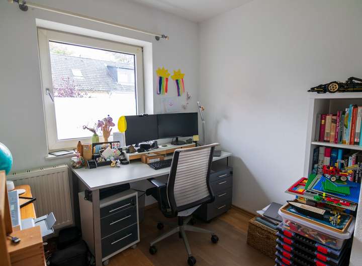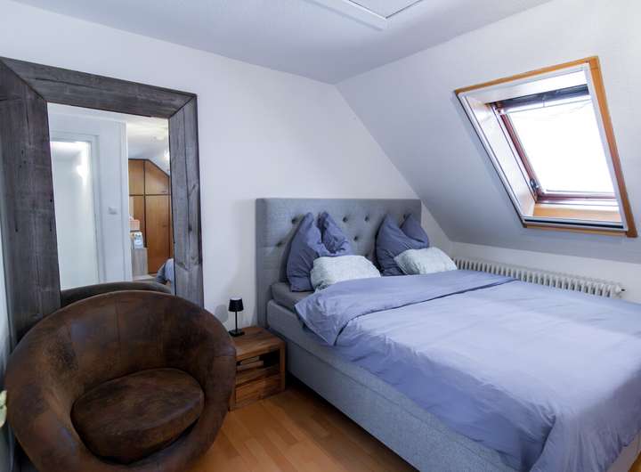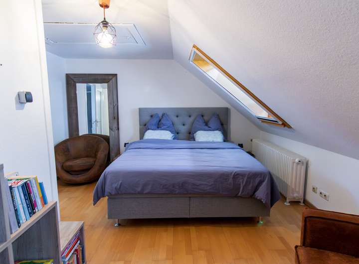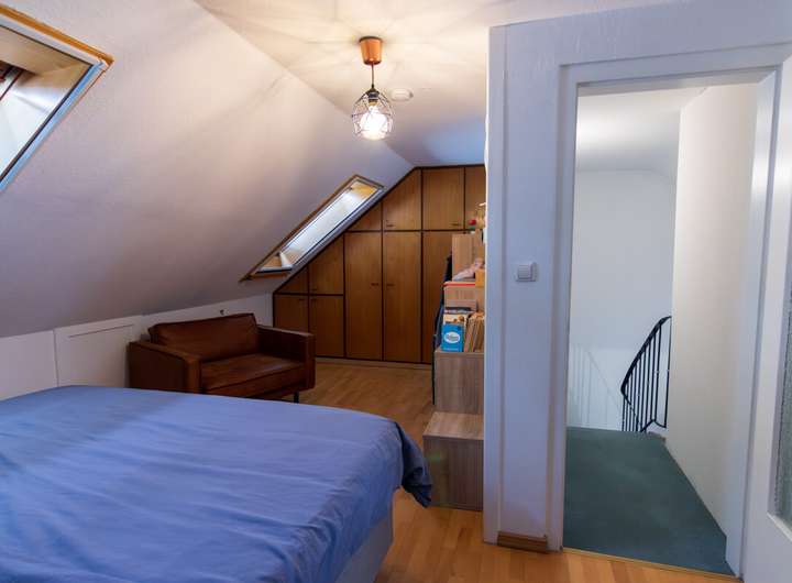 Parkett im Wohnzimmer und im Dachgeschoss, Laminat in den Wohnräumen im Obergeschoss, Fliesen in der Küche und im Flur