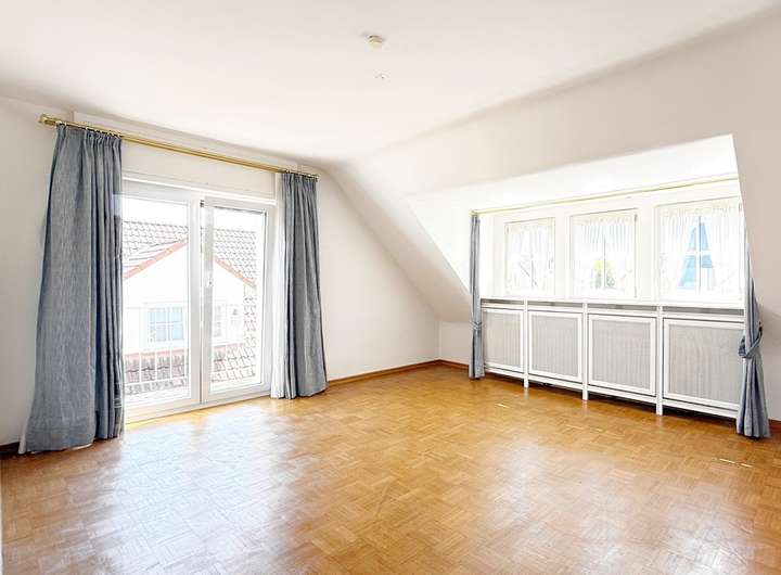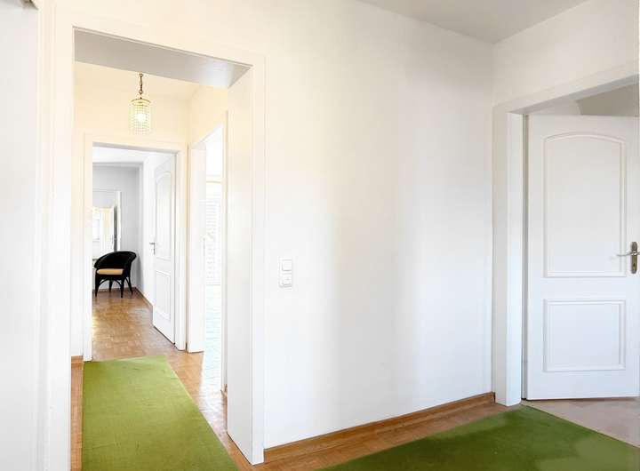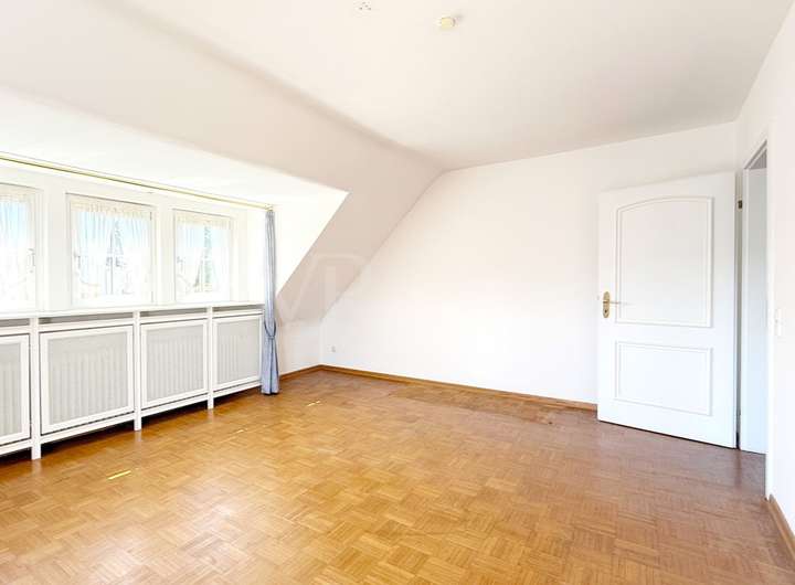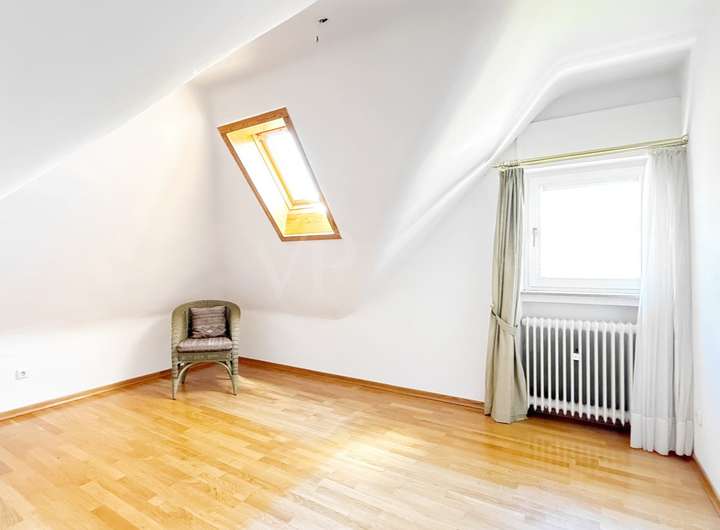 Über eine stilvoll integrierte, geschwungene Holztreppe mit großem, sonnigem Fenster ist das Obergeschoss zu erreichen. Dort befinden sich zwei größere und ein kleineres Zimmer, ein Ankleidezimmer (inkl. Küchenanschlüsse – hier könnte bei Bedarf auch ein weiteres Bad entstehen) sowie ein Tageslichtbad mit Wanne. Ein kleiner Balkon vor dem größeren Schlafzimmer erweitert zusätzlich das Raumgefühl.