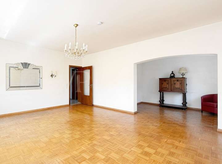 Der große Dielen- und Garderobenbereich ist mit Natursteinboden ausgestattet. Von dort aus eröffnet sich das großzügige und sonnige Wohnzimmer und der angrenzende Ess- und Lesebereich, der mit hochwertigem Stäbchenparkettboden ausgestattet ist. Die Küche könnte zum Essbereich hin geöffnet werden, um die Großzügigkeit noch zu unterstreichen. Diese Wohnebene wird durch ein weiteres Zimmer, das sich gut als Gäste- oder Arbeitszimmer gut eignen würde, sowie ein Duschbad ergänzt.